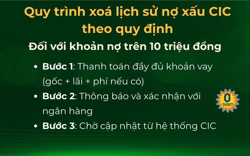 Nếu bạn gặp khó khăn trong việc thanh toán nợ, hãy nhanh chóng liên hệ với các tổ chức cho vay để có thể điều chỉnh kỳ hạn và gia hạn nợ. Với nợ xấu dưới 10 triệu, khi đã hoàn tất khoản vay, ngân hàng sẽ báo cáo cho CIC để thông tin này được xóa. Tuy nhiên, cần nhớ rằng quy trình này vẫn cần thời gian.