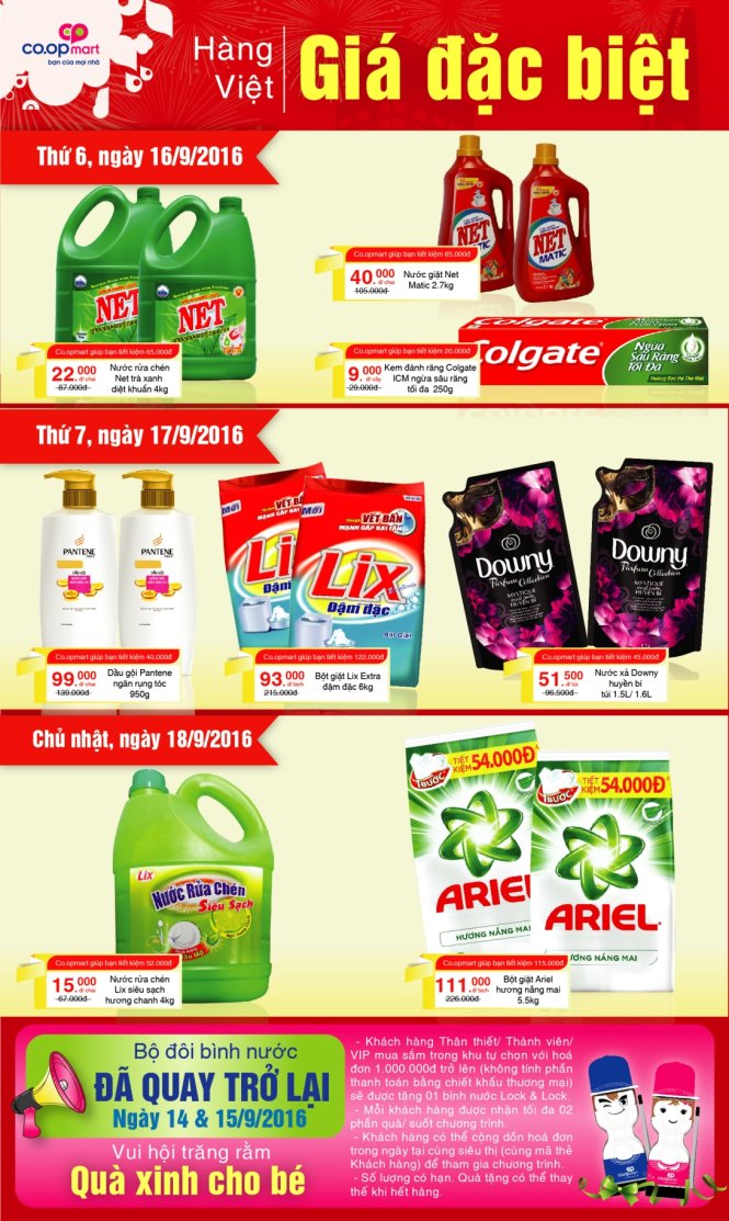Bạn có biết siêu thị Co.opmart đang có chương trình khuyến mãi siêu hời cho nước giặt không? Đặc biệt là nước giặt Lix đậm đặc 3,8kg, giá gốc khoảng 152.200đ nhưng mua sản phẩm thứ hai chỉ còn 2.900đ/chai thôi. Thật sự là cơ hội vàng để tích trữ đồ dùng hàng ngày với mức giảm sốc như vậy!