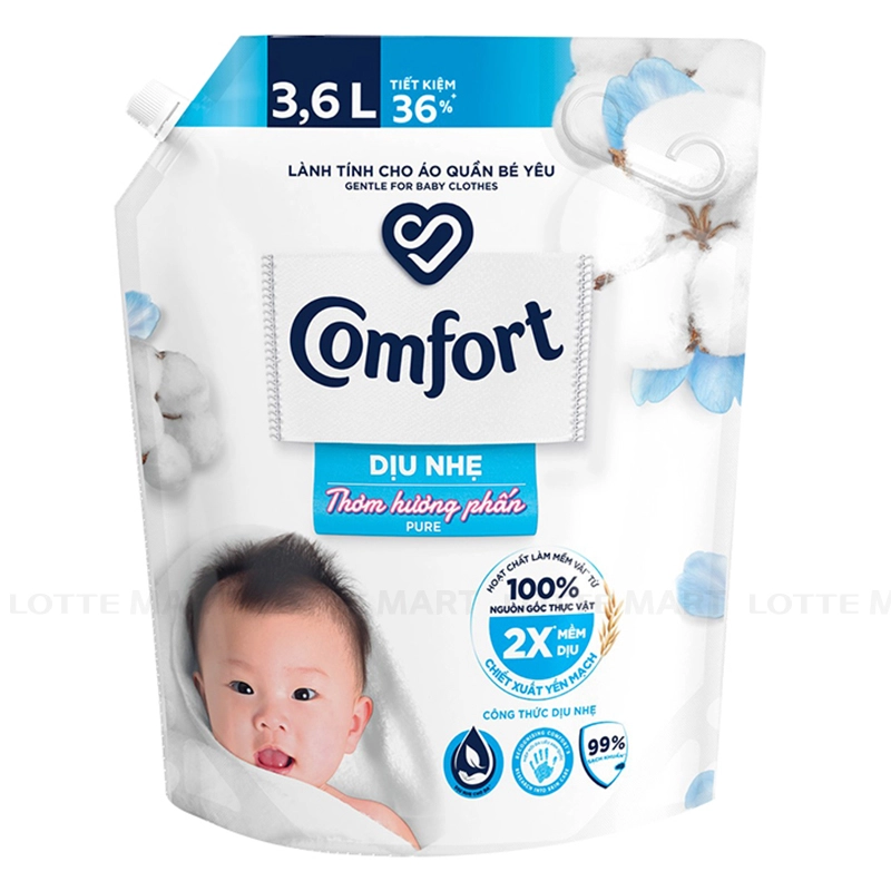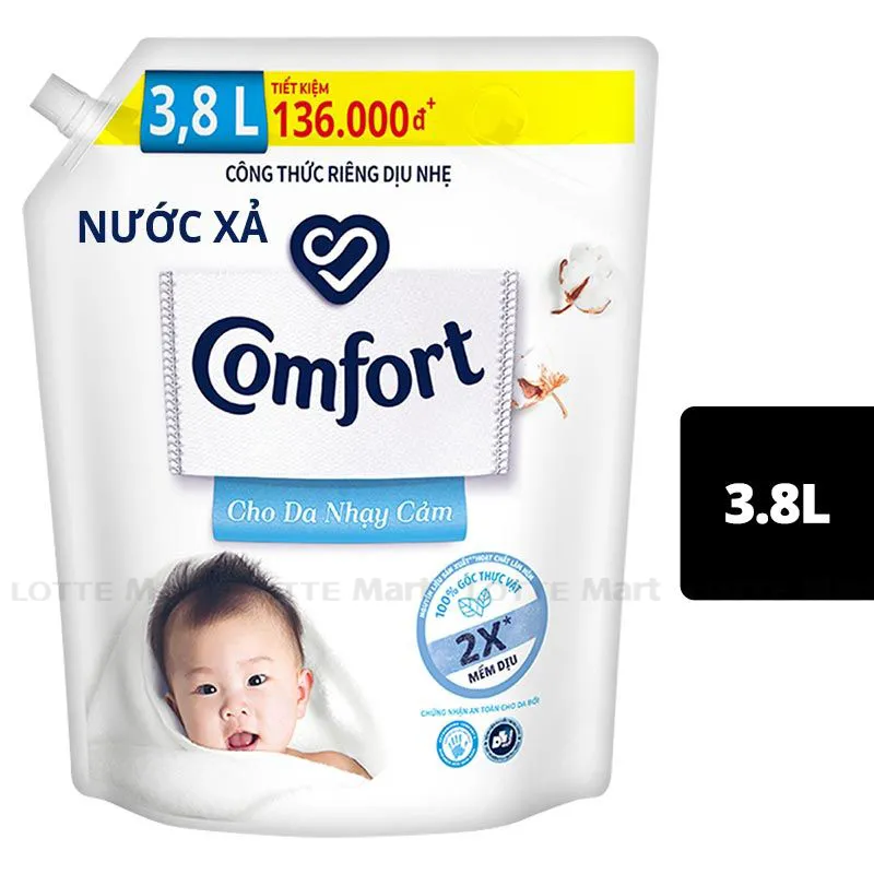 Lotte Mart cũng là lựa chọn hay với nước xả Comfort em bé hương phấn thơm túi 3.6L, khoảng 284.900đ, chiết xuất yến mạch tự nhiên an toàn cho da nhạy cảm, khử mùi sữa hiệu quả.