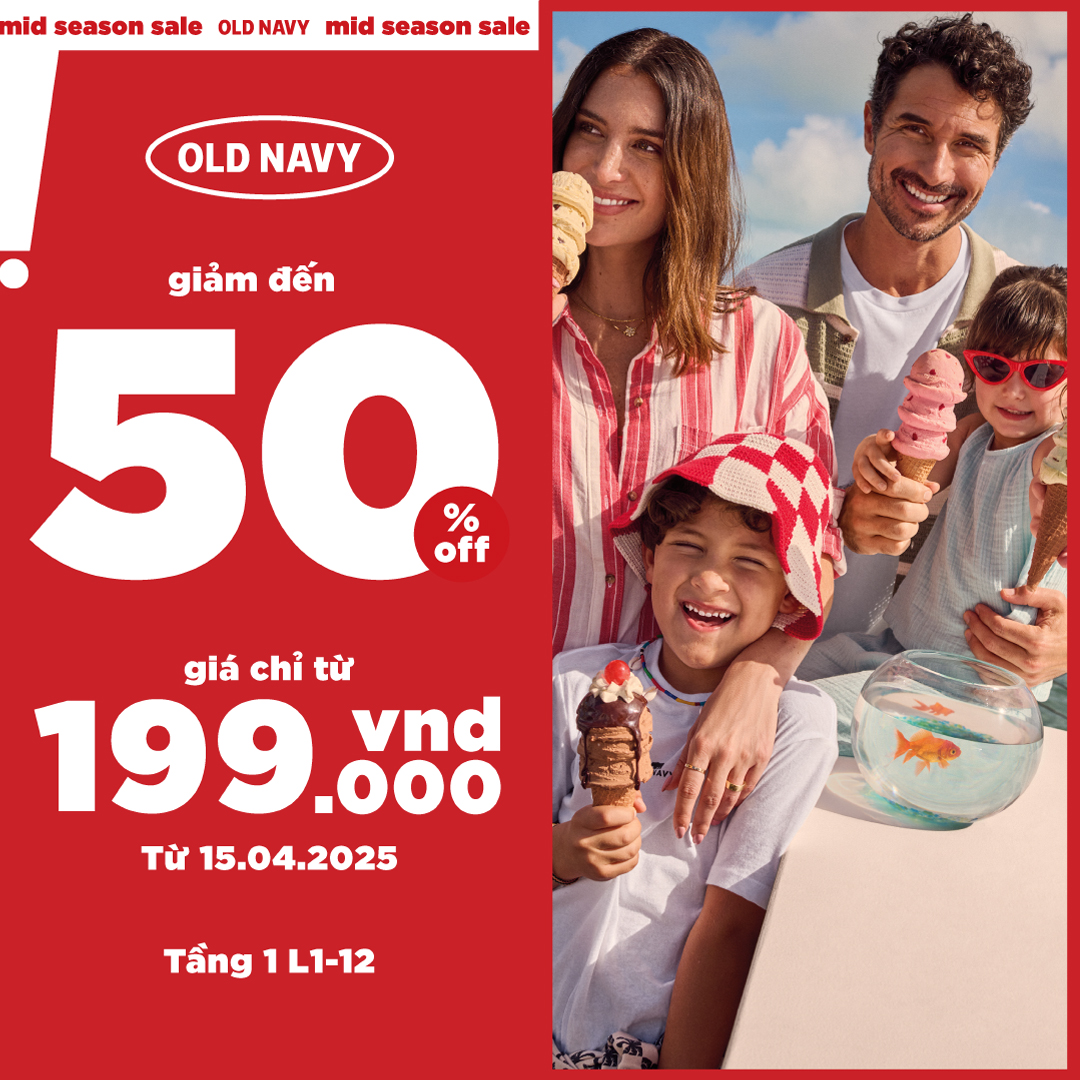 Bên cạnh đó, từ ngày 23/4 đến 5/5/2025, Old Navy tổ chức chương trình Mid Season Sale với ưu đãi mua 2 tặng 1 áp dụng cho tất cả sản phẩm mới tại cửa hàng Estella Place. Khách hàng có thể thoải mái lựa chọn các sản phẩm yêu thích và tiết kiệm chi phí đáng kể. Đây là dịp lý tưởng để cập nhật tủ đồ mùa hè với nhiều lựa chọn đa dạng.