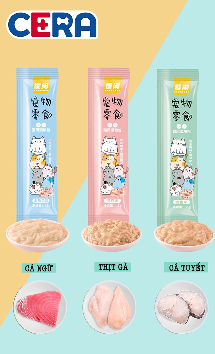 Đừng bỏ qua Wanpy Happy giàu protein, omega 3 làm đẹp lông, không phẩm màu; hay Moochie Creamy dạng sốt kem Ít muối, taurine dồi dào. Snappy Tom kết hợp cá ngừ với trái cây, King Pet lon lớn thơm ngon cũng được yêu thích rộng rãi.