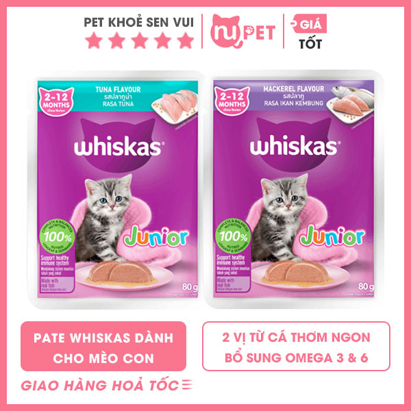 Đầu tiên phải kể đến Pate Whiskas Junior cho mèo con, dành cho bé từ 2 tháng tuổi. Với thành phần cá ngừ, cá thu, xương gà và vitamin, loại này hỗ trợ phát triển toàn diện, hệ tiêu hóa non nớt. Bé nhà mình ăn là mê mẩn ngay!