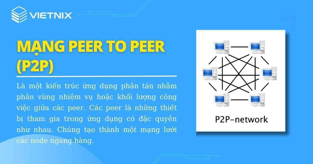 Khác với mô hình client-server truyền thống, P2P không phân chia rõ ràng vai trò máy chủ và máy khách mà mọi nút đều có thể đóng vai trò của cả hai. Nhờ vậy, mạng P2P rất linh hoạt và phân tán, giảm thiểu sự phụ thuộc vào một điểm trung tâm, giúp tăng tính ổn định và khả năng mở rộng của hệ thống.