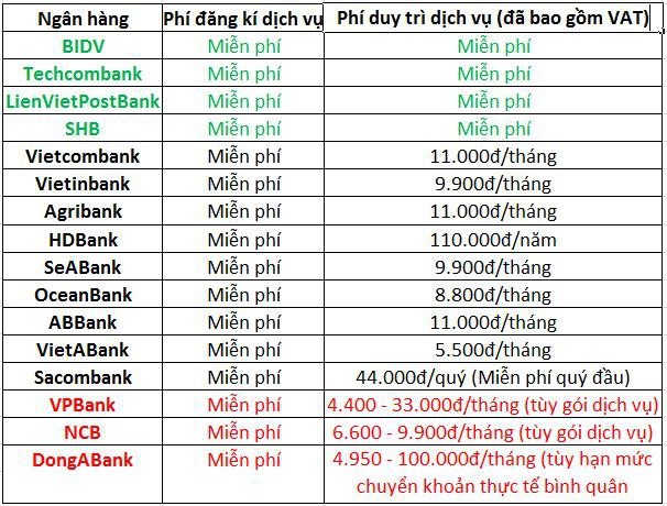 Mỗi khách hàng cá nhân sẽ phải trả 10.000 VNĐ/tháng cho mỗi tài khoản, còn đối với tổ chức, mức phí là 50.000 VNĐ/tháng. Đặc biệt, từ tin nhắn thứ 15 trở đi, khách hàng sẽ bị tính thêm 800 đồng cho mỗi tin nhắn vượt mức (chưa có VAT). Không chỉ tiết kiệm chi phí so với SMS Banking, dịch vụ này còn đảm bảo nhanh chóng và bảo mật tối ưu cho mọi giao dịch.