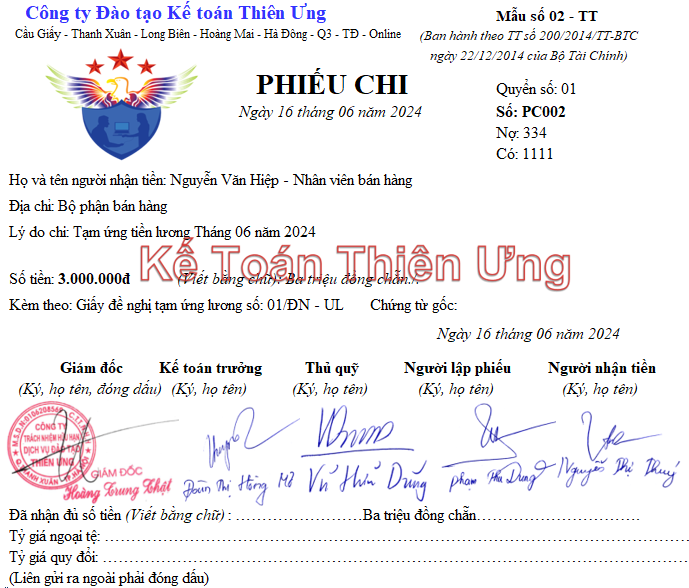 Ngoài ra, một phiếu chi hợp lệ cần có ba liên và kèm theo đầy đủ chữ ký của người lập phiếu, thủ quỹ, kế toán trưởng và giám đốc. Tất cả các thông tin này không chỉ giúp việc quản lý tài chính trở nên chặt chẽ mà còn góp phần nâng cao tính minh bạch trong hoạt động kế toán của doanh nghiệp.