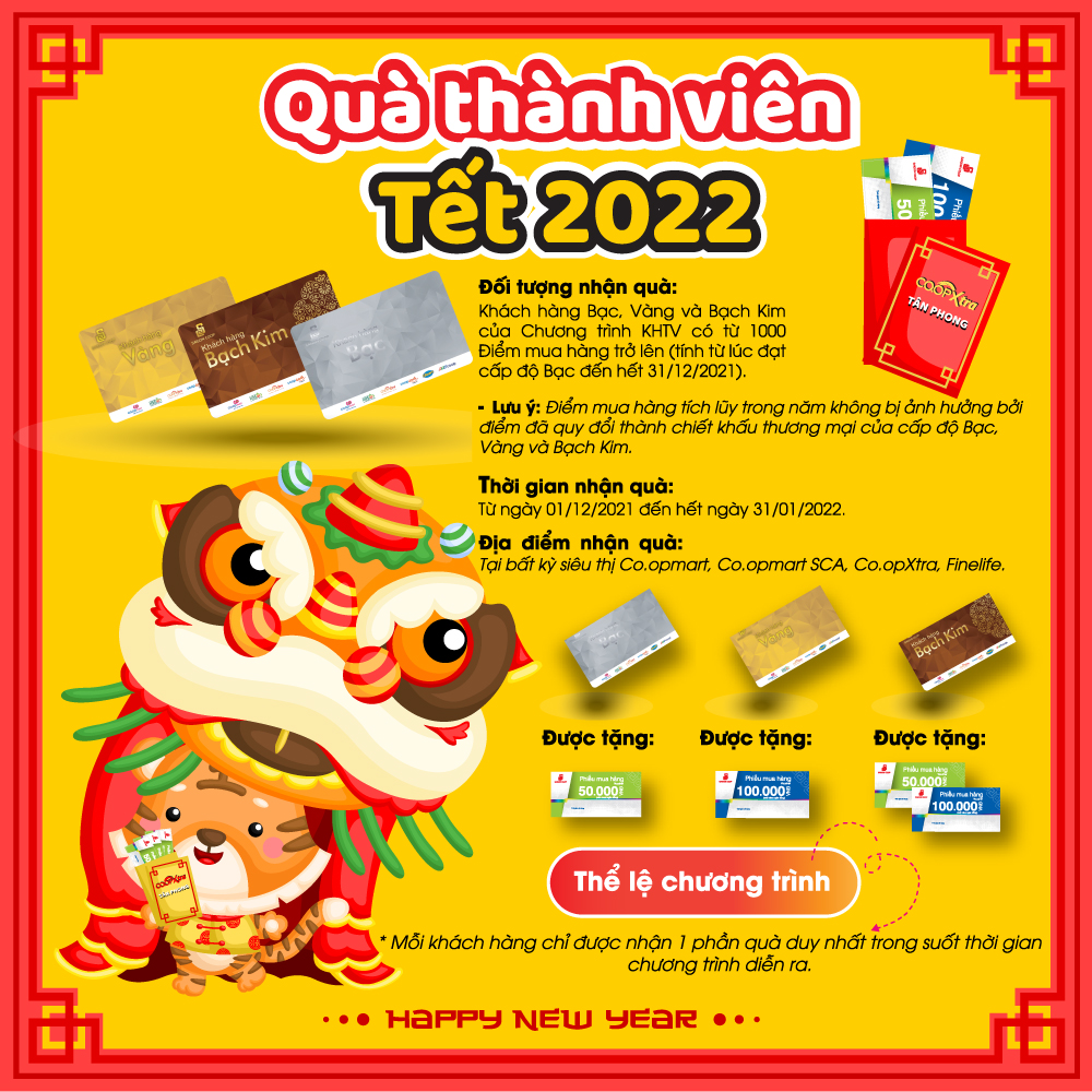 Đối với khách hàng Bạch Kim, Co.opmart dành tặng 01 Phiếu mua hàng 100.000đ, 03 xấp Bao lì xì và 01 Bộ chén xinh xắn. Còn với khách hàng Bạc, sẽ được nhận 01 Phiếu mua hàng 50.000đ cùng 03 xấp Bao lì xì. Tất cả đều hướng tới tạo nên không khí vui tươi, ấm cúng cho dịp Tết đến!