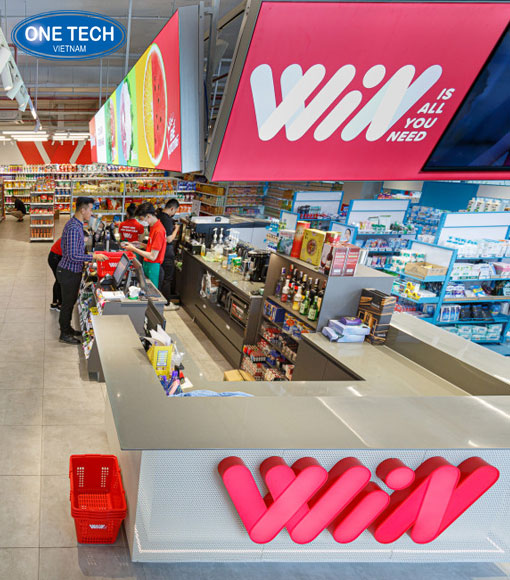 Quầy thu ngân Vinmart là một trong những biểu tượng đặc trưng của thương hiệu với màu sắc đỏ – trắng nổi bật. Cùng với logo dễ nhận diện, quầy thu ngân không chỉ đơn thuần là nơi thanh toán, mà còn góp phần khẳng định hình ảnh thương hiệu trong mắt khách hàng.