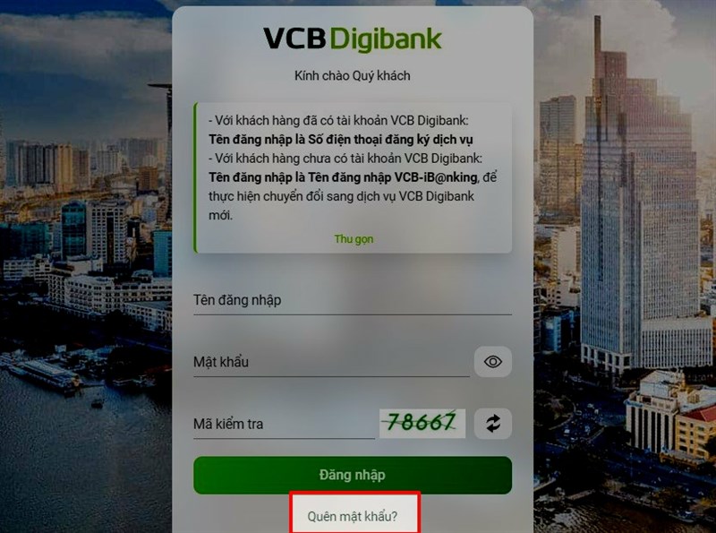 Nếu bạn không thể thực hiện trên điện thoại, đừng lo lắng! Bạn cũng có thể đến bất kỳ điểm giao dịch nào của Vietcombank để được hỗ trợ trực tiếp. Một lựa chọn khác là truy cập trang web VCB Digibank qua đường link https://vcbdigibank.vietcombank.com.vn. Tại đây, chọn “Quên mật khẩu” và thực hiện theo hướng dẫn để lấy lại mật khẩu mới.