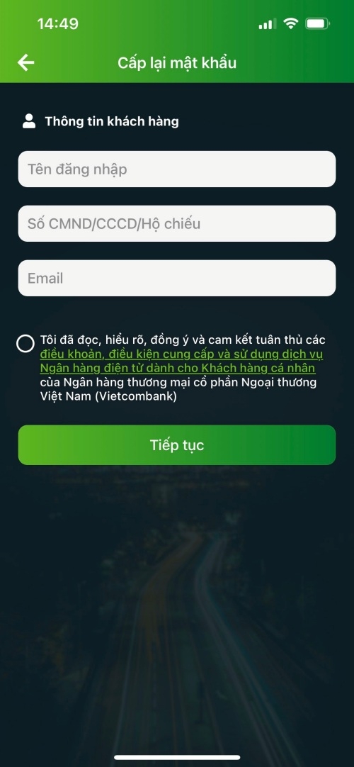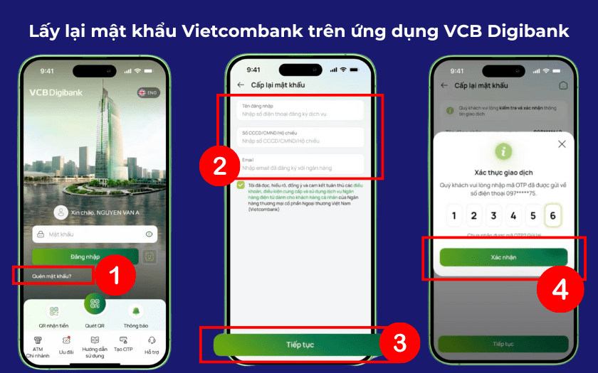 Ngoài ra, nếu bạn đang sử dụng ứng dụng VCB Digibank, quy trình cũng rất đơn giản. Mở ứng dụng, chọn “Quên mật khẩu”, sau đó nhập số điện thoại và số CMND/CCCD của bạn. Hệ thống sẽ gửi mật khẩu mặc định vào email đã đăng ký để bạn đăng nhập lại và thay đổi mật khẩu mới.
