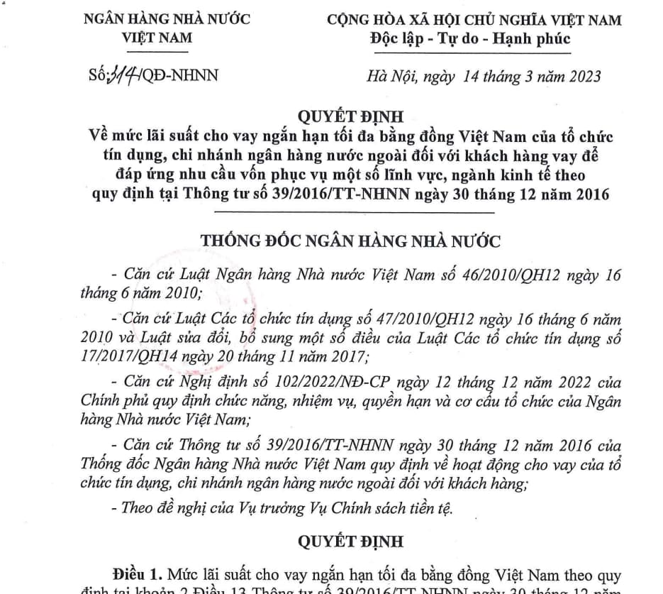 Từ ngày 19/6/2023, Ngân hàng Nhà nước ban hành Quyết định 1125/QĐ‑NHNN, theo đó quy định mức lãi suất cho vay ngắn hạn bằng đồng Việt Nam tối đa dành cho Quỹ tín dụng nhân dân và tổ chức tài chính vi mô là 5,0%/năm. Quyết định này thay thế Quyết định 576/QĐ‑NHNN (31/3/2023), điều chỉnh nhằm hỗ trợ chi phí vốn cho các tổ chức tài chính quy mô nhỏ.