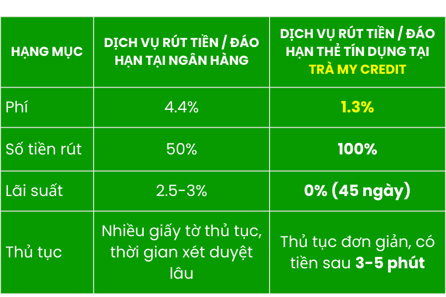 Nếu bạn rút tiền tại cây ATM của ngân hàng HSBC, bạn sẽ không mất phí. Tuy nhiên, nếu rút tại các ATM thuộc mạng Visa/Plus hay Techcombank, bạn sẽ mất phí nhỏ khoảng 5.000 VND cho mỗi giao dịch. Đặc biệt, với dịch vụ rút tiền qua POS tại Trà My Credit, bạn có thể tận dụng toàn bộ hạn mức thẻ tín dụng của mình trong thời gian lên đến 45 ngày.
