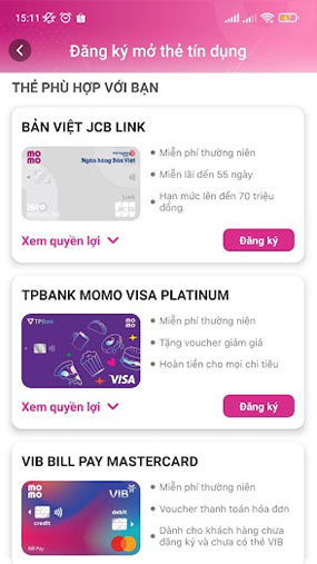 Ngoài ra, nếu bạn muốn mở thẻ tín dụng, hãy tìm kiếm “Mở thẻ tín dụng” trên thanh tìm kiếm tại màn hình chính. Tiến hành theo hướng dẫn để hoàn tất việc đăng ký. Với thẻ tín dụng TPBank MoMo Visa Platinum, bạn có thể mua sắm dễ dàng ở mọi nơi, từ trong nước đến quốc tế.