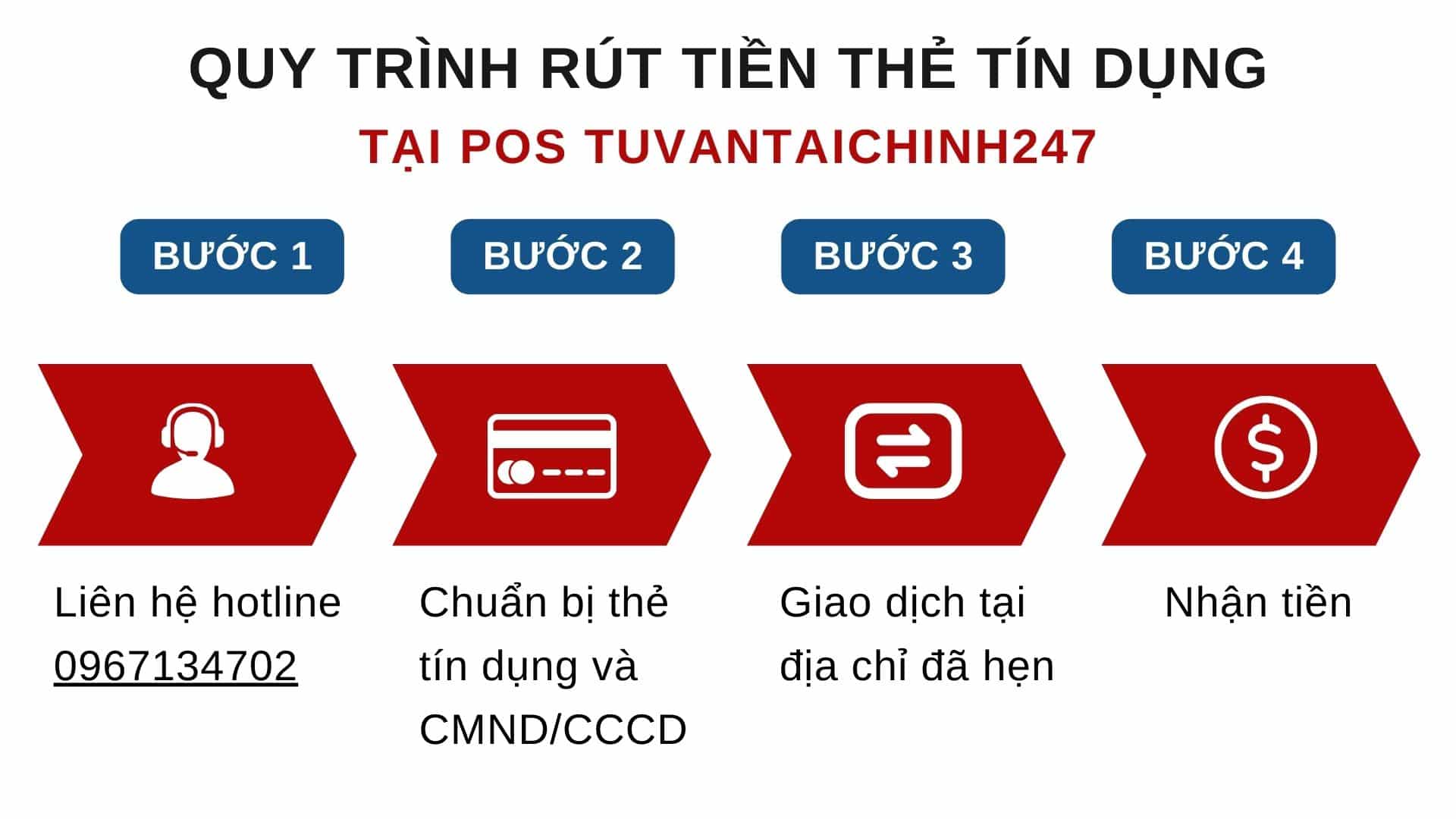 Bạn chỉ cần gọi đến hotline 0933.558.639 hoặc nhắn Zalo để cung cấp thông tin cơ bản như loại thẻ, số tiền cần rút và địa chỉ của bạn. Quy trình rút tiền cực kỳ đơn giản với chỉ ba bước: gọi nhân viên, đến cơ sở gần nhất mang theo thẻ và CMND, sau đó quẹt thẻ để nhận tiền mặt.