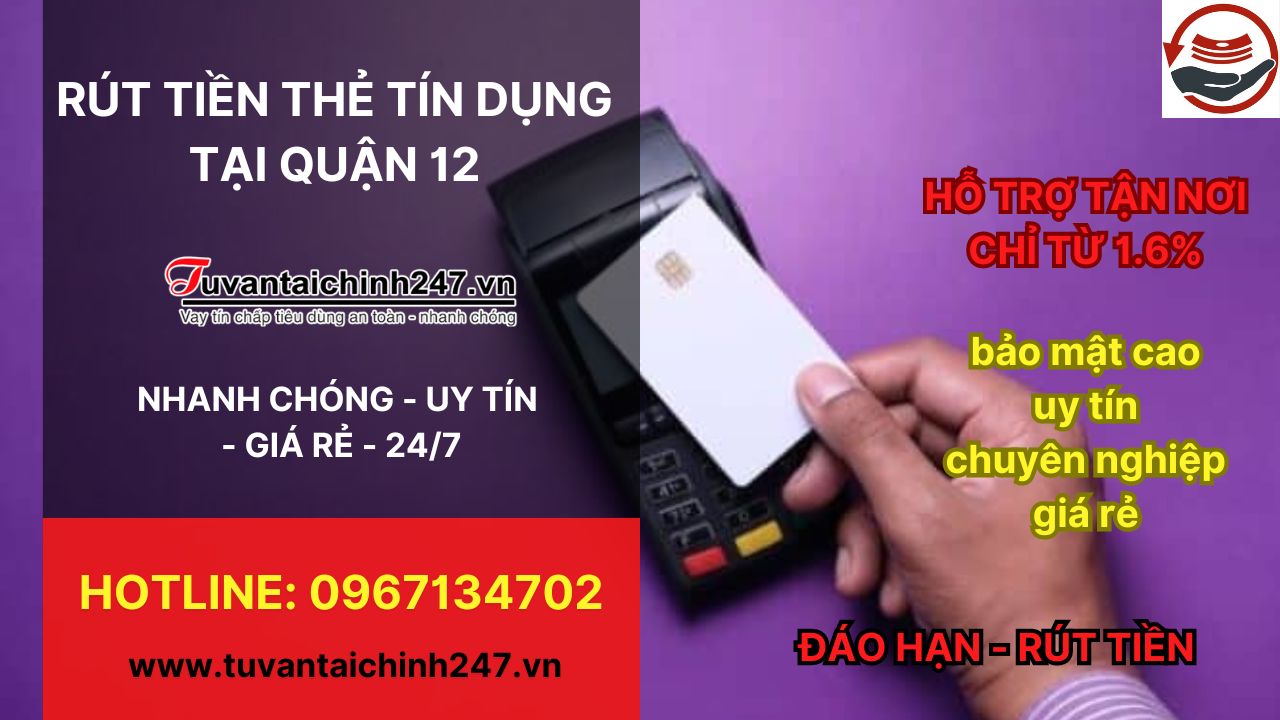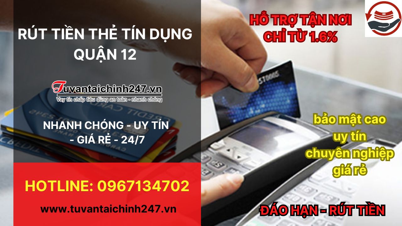 Dịch vụ rút tiền thẻ tín dụng ở Quận 12 hiện đang trở thành sự lựa chọn phổ biến của nhiều người. Các đơn vị như A2A, Tín Dụng 365 hay Tư Vấn Tài Chính 247 đều cung cấp dịch vụ này với mức phí chỉ 1,6% cực kỳ hấp dẫn. Bạn chỉ cần gọi điện đến số hotline 090.898.7476, đội ngũ nhân viên sẽ có mặt tại nhà bạn trong vòng 30 phút.