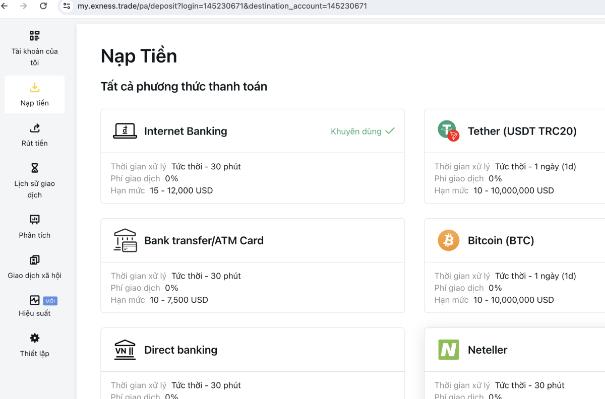 Dù vậy, Exness vẫn thu hút nhiều nhà đầu tư Việt nhờ hỗ trợ tiếng Việt và các phương thức nạp – rút tiền thuận tiện như Internet Banking, ví điện tử và tiền mã hóa. Nhà đầu tư có thể dễ dàng nạp tiền từ các ngân hàng lớn trong nước với số tiền tối thiểu khoảng 15 USD. Nhưng do chưa có sự quản lý chính thức từ cơ quan chức năng Việt Nam, người chơi cần cân nhắc kỹ rủi ro trước khi tham gia.