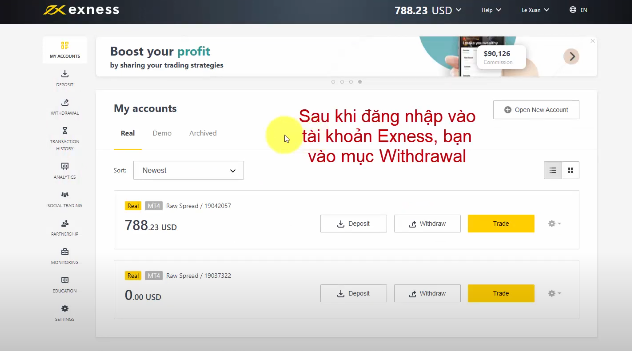 Việc rút tiền từ sàn Exness về ngân hàng khá đơn giản và nhanh chóng, phù hợp với nhiều nhà đầu tư. Đầu tiên, bạn cần đăng nhập vào tài khoản Exness của mình, sau đó chọn mục “Rút tiền” và chọn hình thức rút qua Internet Banking để chuyển trực tiếp về tài khoản ngân hàng nội địa. Tiếp theo, bạn chọn tài khoản giao dịch muốn rút, nhập số tiền cần rút và xác nhận bằng mã OTP gửi về điện thoại.