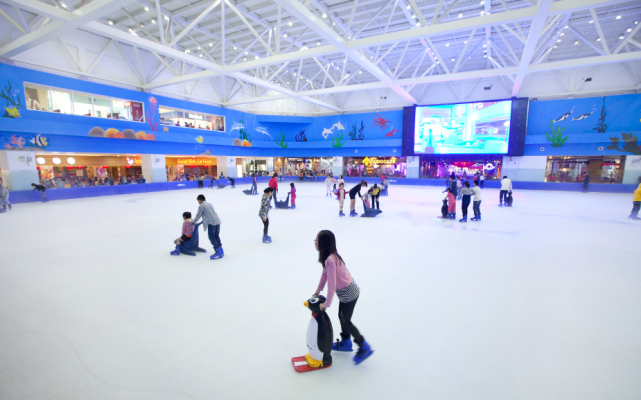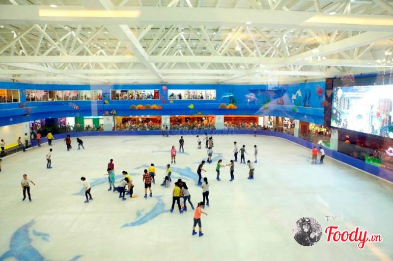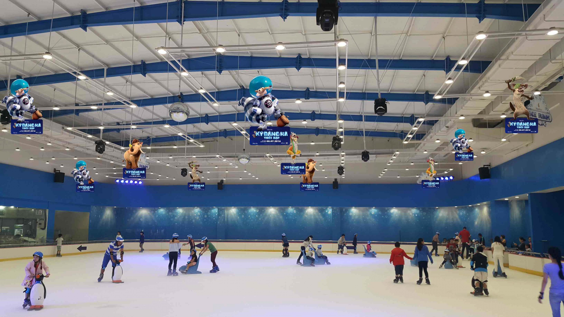 Sân có diện tích rộng hơn 1200m2 với mặt băng dày 100mm, đạt tiêu chuẩn quốc tế. Hệ thống làm lạnh và thông gió sử dụng công nghệ tiên tiến nhập khẩu từ châu Âu và Mỹ, mang đến trải nghiệm trượt băng mượt mà và an toàn. Sân có thể phục vụ tới 150 khách mỗi phiên, phù hợp cho nhiều hoạt động như trượt băng nghệ thuật, múa trên băng hay hockey.