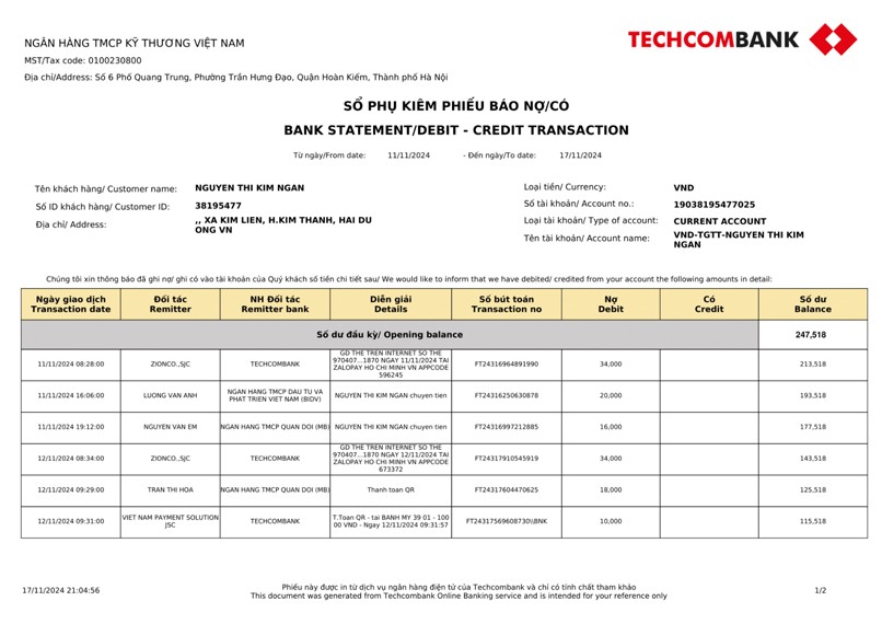 Lưu ý sao kê thẻ tín dụng là báo cáo tổng hợp mọi giao dịch trong kỳ; nếu ra quầy in sao kê truyền thống, tuỳ thời điểm có thể được miễn phí bản đầu hoặc thu phí nhỏ. Hãy khám phá các dịch vụ số của Techcombank để nâng tầm tiện ích và bảo mật cho tài khoản của bạn.