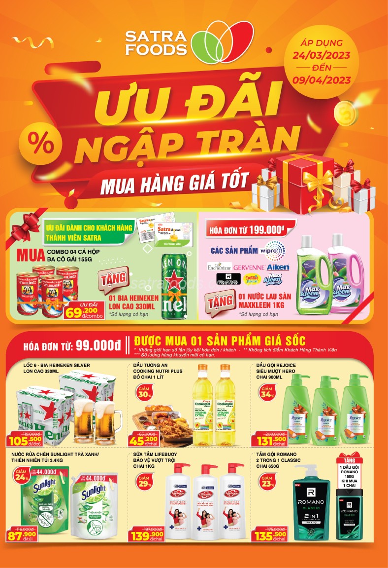 Về chương trình ưu đãi, Satrafoods thường xuyên tổ chức các đợt khuyến mãi hấp dẫn với mức giảm giá sâu, giúp khách hàng tiết kiệm đáng kể khi mua sắm. Các chương trình này thường diễn ra vào cuối tuần hoặc dịp lễ, kèm theo nhiều quà tặng hấp dẫn, tạo điều kiện thuận lợi để người tiêu dùng tiếp cận sản phẩm chất lượng với giá tốt.