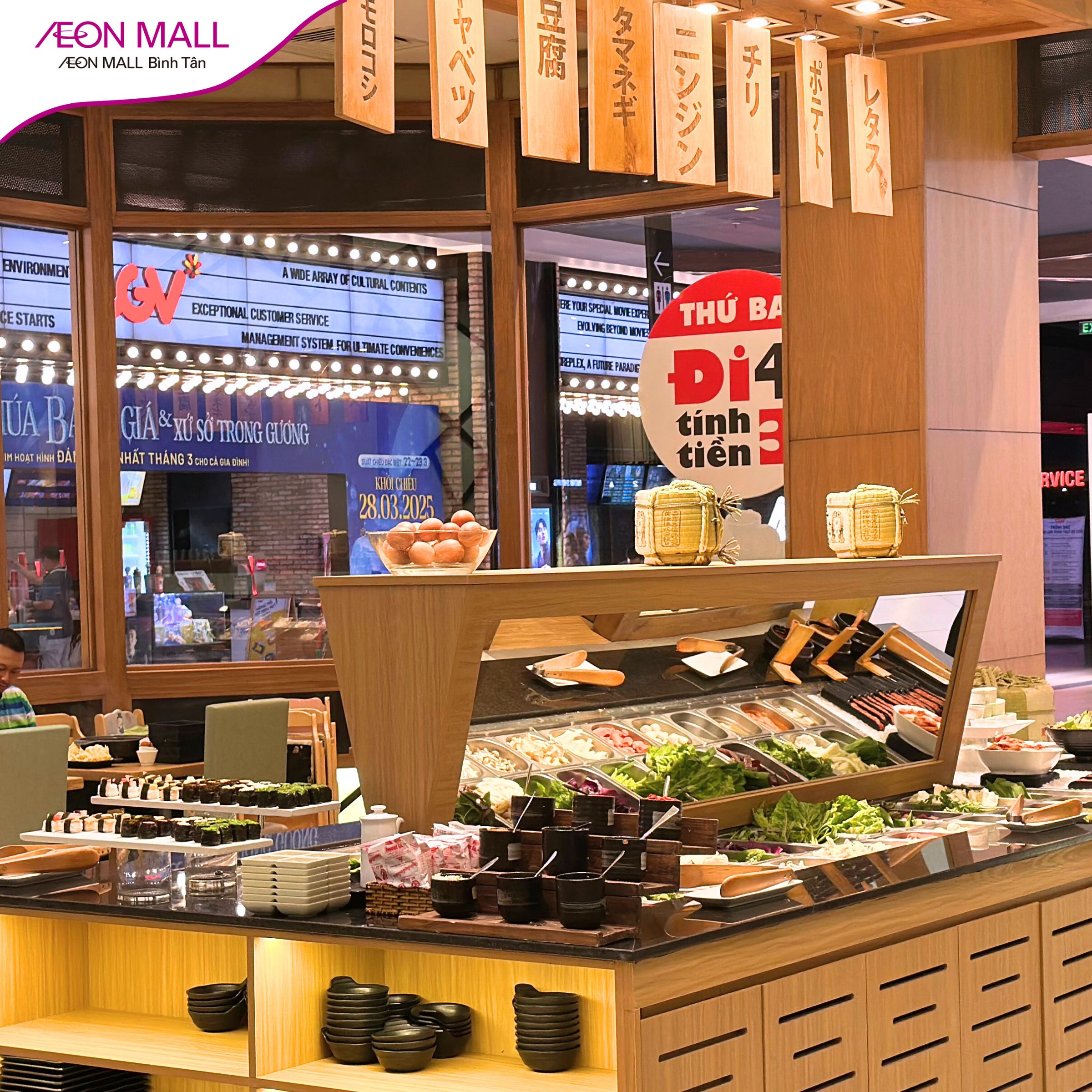 Shabu Ya tại AEON Mall Bình Tân là địa điểm lý tưởng cho những tín đồ mê lẩu Nhật Bản. Tại đây, bạn sẽ có cơ hội thưởng thức buffet lẩu không giới hạn với các món thịt bò thượng hạng, được cắt theo phong cách Nhật Bản rất độc đáo. Đặc biệt, vào mỗi thứ Ba, chương trình “Đi 4 tính tiền 3” vừa tiết kiệm vừa thú vị chắc chắn sẽ khiến bạn thích thú.