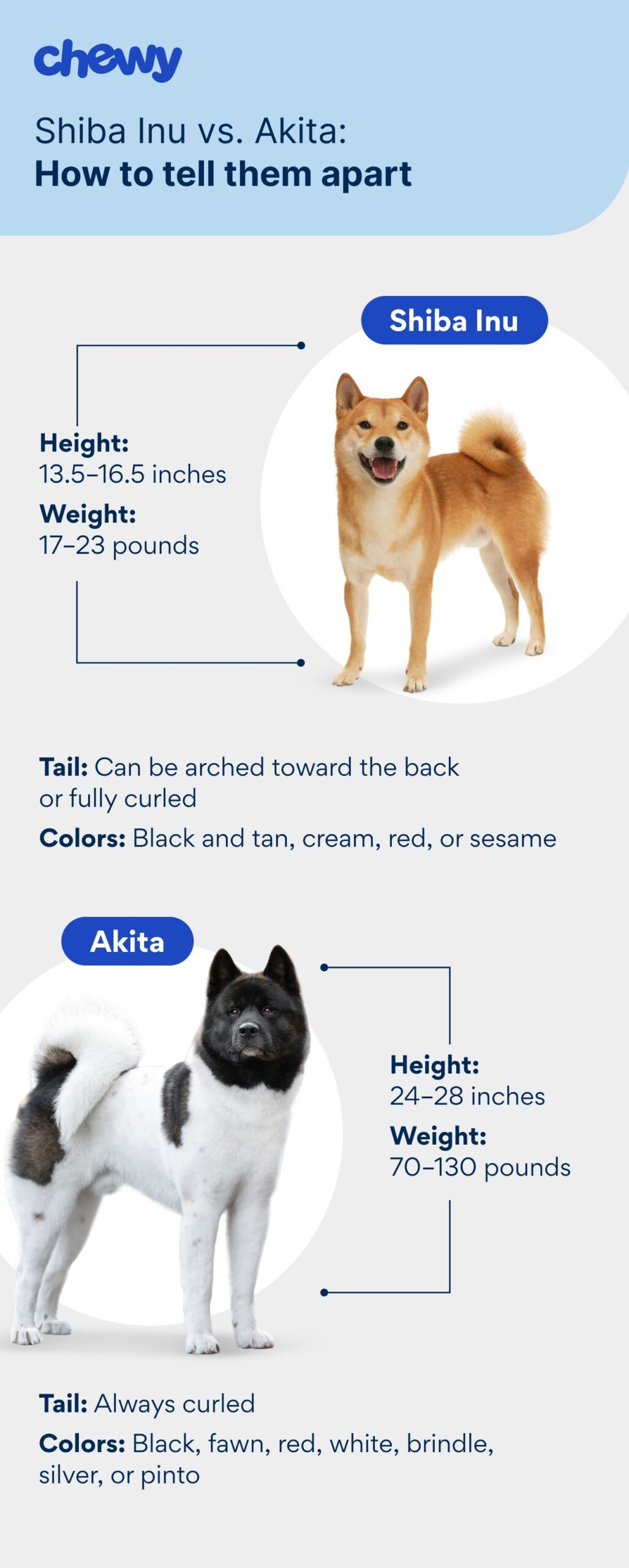 Về màu lông, Shiba thường có đỏ, sesame, cream hoặc đen-tan, khá hạn chế. Akita đa dạng hơn: trắng, brindle, đỏ, đen, thậm chí pinto với mảng màu lớn. Đuôi Akita cuộn chặt hơn, đôi khi kép, còn Shiba cong vừa phải.