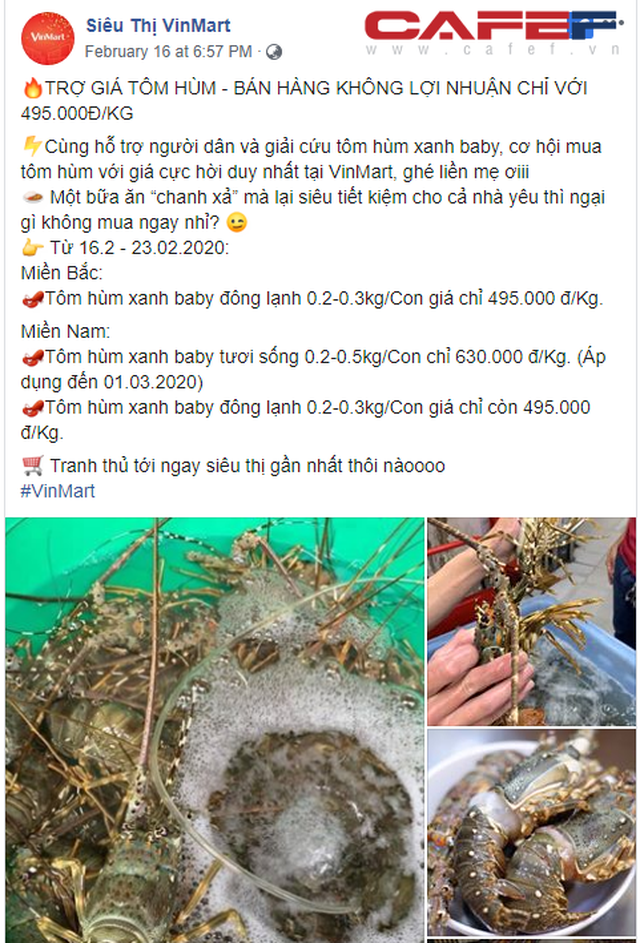 Chương trình này được áp dụng tại 5 siêu thị VinMart ở Hà Nội, nhằm hỗ trợ nông dân trong bối cảnh dịch bệnh. VinMart cam kết không lợi nhuận từ việc bán hàng, đồng thời đảm bảo ổn định giá cho sản phẩm tôm hùm, không vượt quá mức đã công bố. Ngoài Hà Nội, cho những bạn ở miền Nam, cũng có tôm hùm tươi sống với giá rất ưu đãi, chỉ 630.000 đồng/kg.