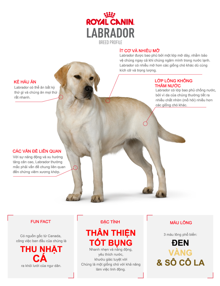 Để giữ sức khỏe tốt, hãy cho chúng chế độ ăn cân bằng: protein từ thịt, cá hỗ trợ cơ bắp; chất béo lành mạnh cho lông da; tinh bột từ cơm, khoai; rau củ giàu vitamin, chất xơ; đặc biệt bổ sung canxi cho xương chắc. Kiểm tra tai thường xuyên, chải lông đều đặn, vận động hàng ngày như bơi lội – Labrador rất thích! Đưa đi khám thú y định kỳ hai lần/năm để phát hiện sớm nhé. Với sự quan tâm chân thành, các bé sẽ luôn tràn đầy năng lượng bên bạn.
