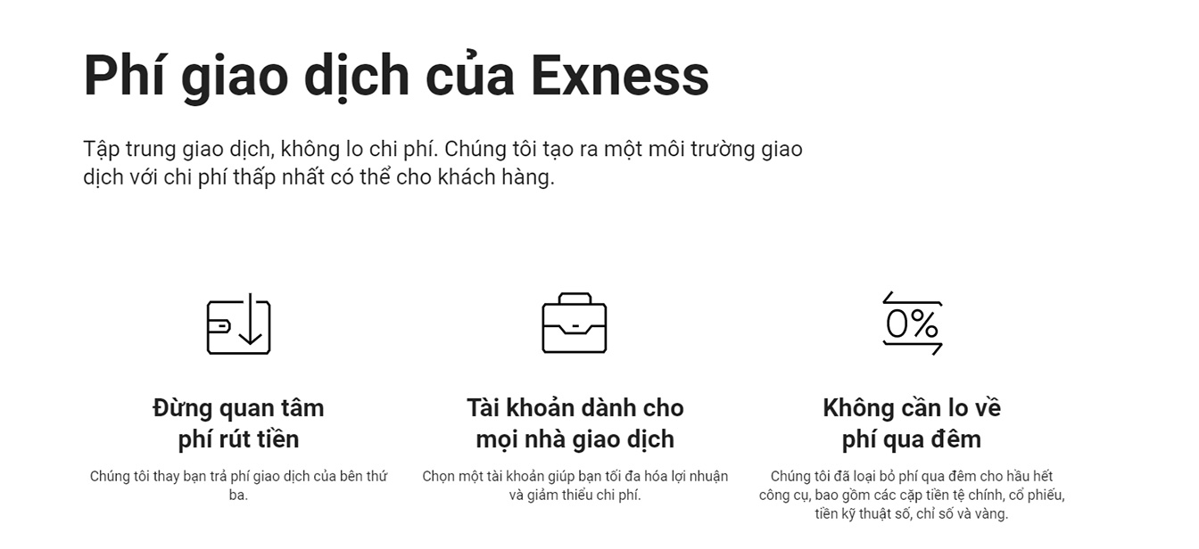 Điểm cộng nữa là Exness không yêu cầu số tiền nạp tối thiểu cao, chỉ từ 1 USD cho tài khoản Standard, giúp người mới dễ dàng tiếp cận. Mức phí hoa hồng của Exness được đánh giá là thấp, đặc biệt với các cặp tiền chính như EUR/USD, USD/JPY chỉ khoảng 7 USD cho mỗi giao dịch đóng mở, phù hợp với trader muốn tối ưu chi phí.