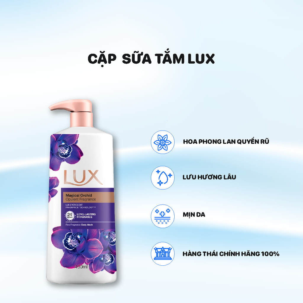 Còn Lux Magical Spell màu tím thì nổi bật với khả năng làm sạch sâu, dịu da nhanh và giữ ẩm tốt. Mùi hương nồng nàn, bám da 2-3 tiếng, giống dòng vàng nhưng vượt trội hơn hẳn.