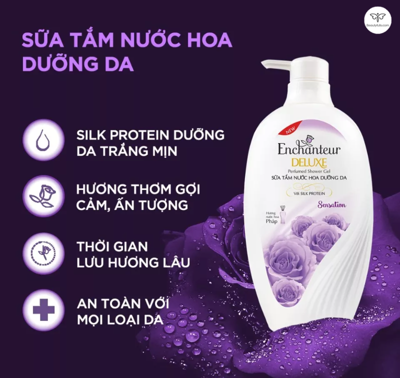 Nếu thích thương hiệu quen thuộc, Enchanteur màu tím Deluxe Sensation là lựa chọn đỉnh cao. Hương nước hoa sang trọng, da mềm mại suốt ngày. Tìm trên Shopee nhé, nhiều shop bán combo giá rẻ từ 58.000đ, freeship dễ dàng.