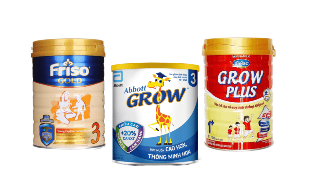 Một số loại sữa được nhiều mẹ tin dùng hiện nay như Frisolac Gold 3, PediaSure, GrowPLUS+ đỏ hay Aptamil số 3 đều có công thức đặc biệt tập trung vào tăng trưởng chiều cao. Ví dụ, sữa Frisolac Gold 3 có nguồn gốc từ Hà Lan, bổ sung canxi, kẽm, photpho và các dưỡng chất giúp xương và răng bé chắc khỏe, đồng thời hỗ trợ tiêu hóa tốt nhờ prebiotics. PediaSure cũng nổi bật với hàm lượng canxi cao và arginin giúp kích thích phát triển tế bào ở đĩa sụn, thúc đẩy chiều cao vượt trội.