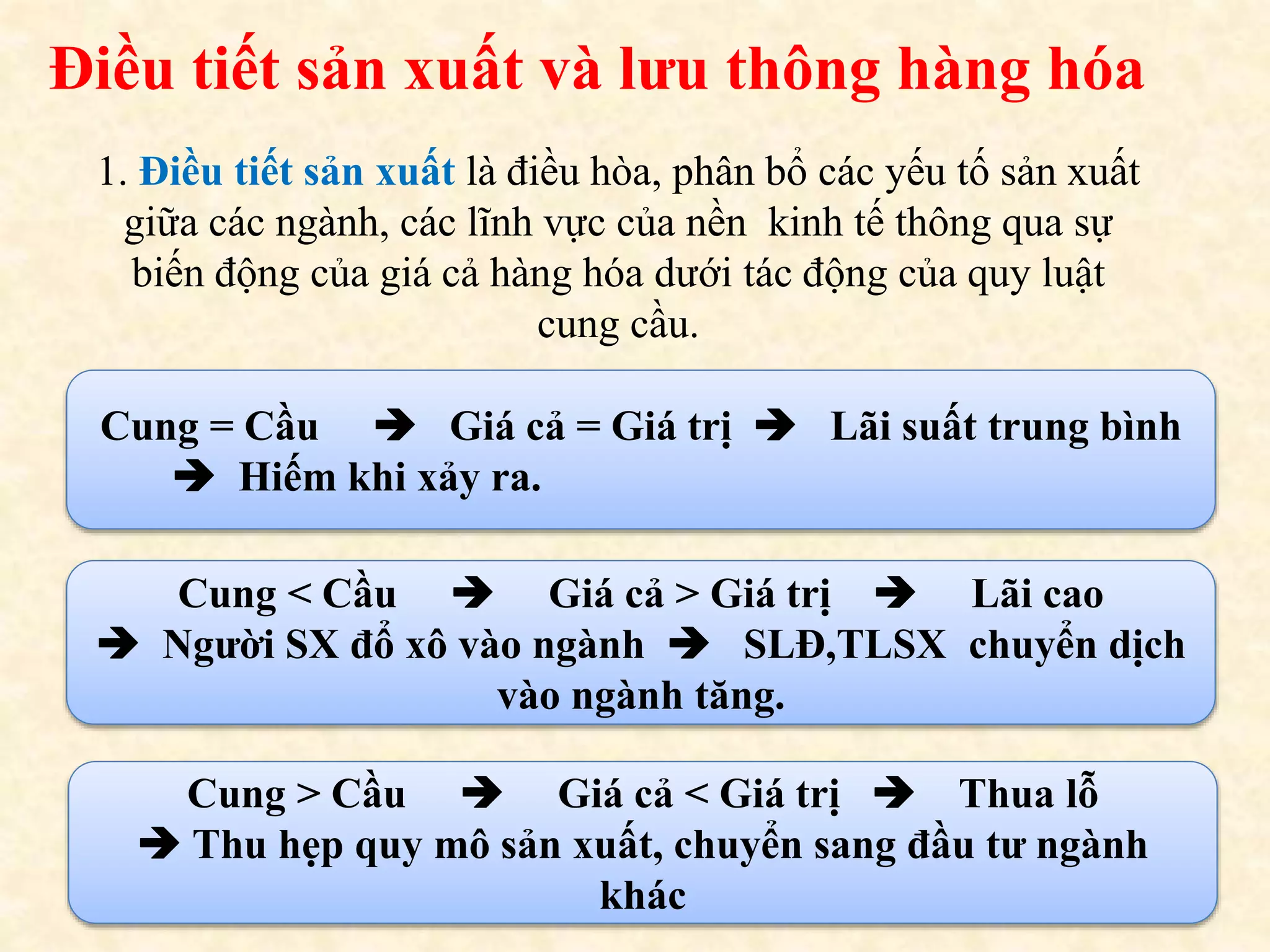 Điều tiết sản xuất và lưu thông hàng hóa là một khái niệm quan trọng trong nền kinh tế, giúp phân bố nguồn lực hiệu quả. Điều này không chỉ giúp tận dụng tốt tư liệu sản xuất và sức lao động mà còn thúc đẩy sự phát triển của các ngành, lĩnh vực có hiệu quả kinh tế cao. Thông qua việc phân bổ này, thị trường sẽ tự động xác định đâu là nhu cầu thực tế của xã hội.