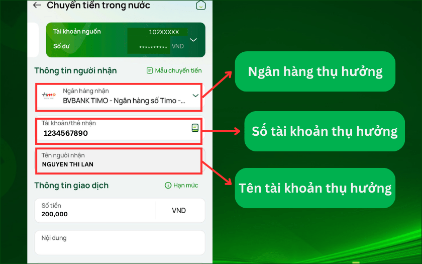 Để thực hiện chuyển khoản đến ngân hàng thụ hưởng, bạn cần cung cấp thông tin chính xác, bao gồm số tài khoản và tên người thụ hưởng. Những thông tin này quyết định việc tiền có được ghi có đúng vào tài khoản của người nhận hay không. Nhờ có tài khoản thụ hưởng, các giao dịch tài chính trở nên thuận tiện và đơn giản hơn rất nhiều.