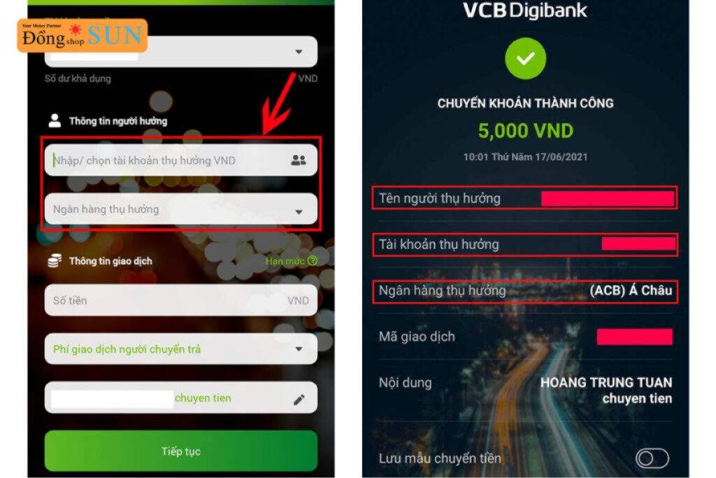 Tiếp theo, bạn sẽ cần điền đầy đủ thông tin liên quan đến giao dịch. Đầu tiên là ngân hàng thụ hưởng, sau đó là số tài khoản người nhận, tên người nhận, số tiền cần chuyển và cả nội dung chuyển khoản để đảm bảo giao dịch diễn ra suôn sẻ.