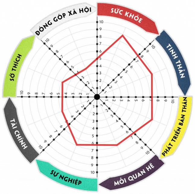Sau khi đã chia xong, hãy thiết lập thang điểm từ 1 đến 10 cho từng lĩnh vực. Điểm số này thể hiện mức độ hài lòng của bạn trong mỗi khía cạnh. Việc này giúp bạn khám phá bản thân và nhận ra đâu là điểm mạnh, đâu là vấn đề cần cải thiện.