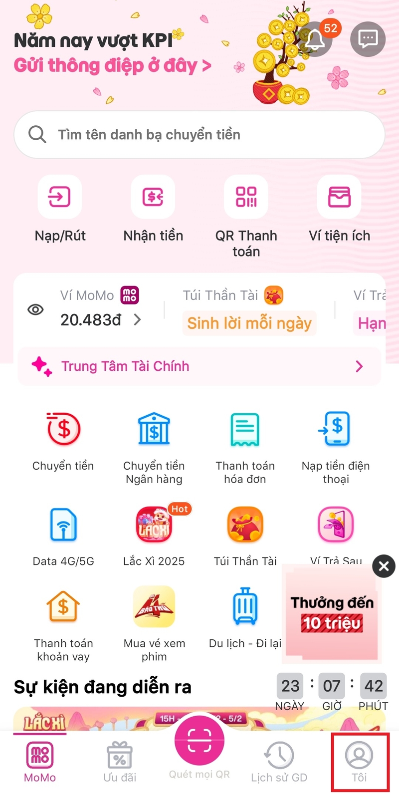 Để nâng hạn mức ví MoMo của bạn, bước đầu tiên là xác thực tài khoản ngân hàng. Việc này thực sự cần thiết vì nếu không liên kết tài khoản ngân hàng, bạn sẽ gặp phải nhiều hạn chế trong giao dịch. Hãy mở ứng dụng MoMo trên điện thoại, sau đó nhấn vào mục “Tôi” ở góc dưới bên phải.