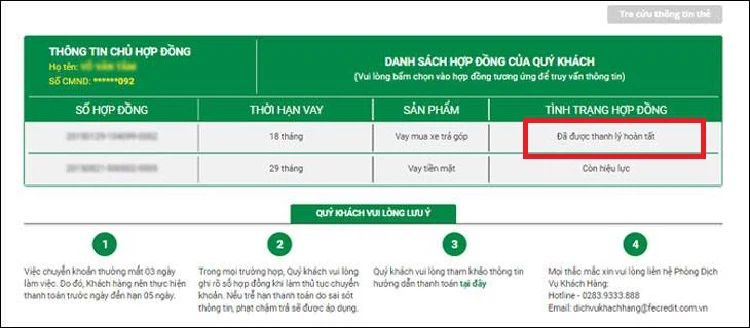 Sau khi hoàn tất thanh toán, khách hàng sẽ ký biên bản xác nhận đã thanh lý hợp đồng vay. FE Credit sẽ cập nhật trạng thái khoản vay thành “Đã được thanh lý hoàn tất” trên hệ thống, tức là hợp đồng vay không còn hiệu lực. Để đảm bảo mọi thông tin đã chính xác, khách hàng nên kiểm tra lại thông tin khoản vay trên trang web của FE Credit.