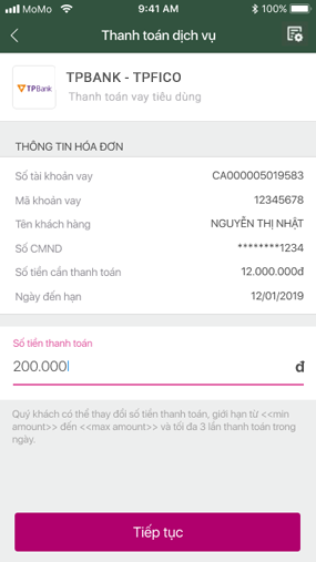 Có nhiều cách để tiến hành thanh toán. Bạn có thể nộp tiền tại các cửa hàng liên kết với TPBank bằng số CMND hoặc hợp đồng vay của mình. Hoặc bạn có thể sử dụng ứng dụng TPBank Mobile để quản lý và thanh toán khoản vay thuận tiện hơn.