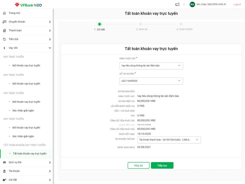 Ngoài ra, VPBank cũng hỗ trợ bạn tất toán online qua ứng dụng VPBank NEO, cực kỳ nhanh chóng và dễ dàng. Bạn chỉ cần vào mục Cho vay, chọn Danh sách khoản vay, rồi chọn khoản vay cần tất toán. Việc thanh toán này giúp bạn không cần chờ đến kỳ hạn mà vẫn có thể kết thúc hợp đồng vay một cách nhanh chóng.