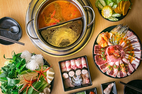 Menu tại Thái BBQ Buffet nổi bật với các món nướng và lẩu Thái đặc trưng, trong đó có các nồi lẩu hai ngăn cho phép thực khách lựa chọn hai vị lẩu khác nhau cùng lúc. Nguyên liệu được đảm bảo tươi ngon, đa dạng từ hải sản, thịt đến rau củ, giúp khách hàng tận hưởng trọn vẹn hương vị chua cay đậm đà đặc trưng của ẩm thực Thái.