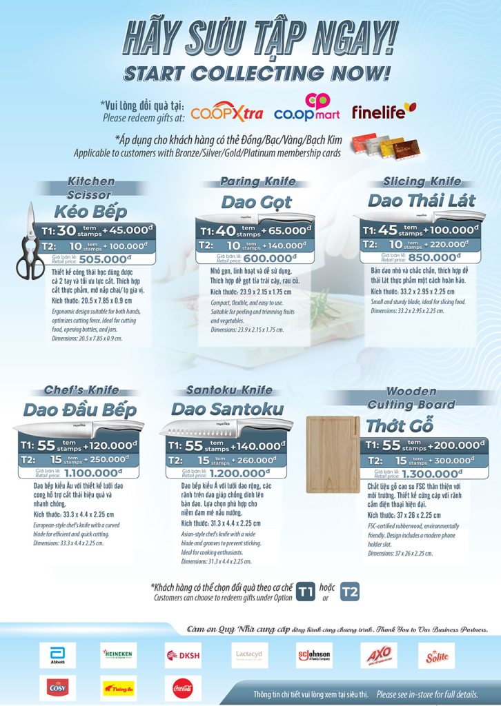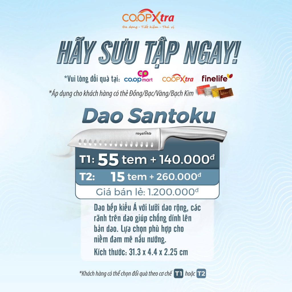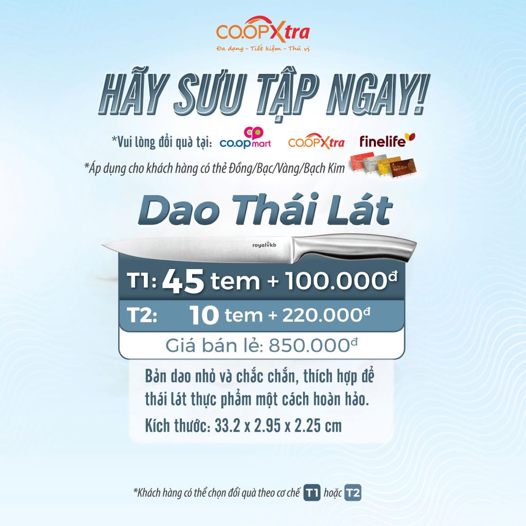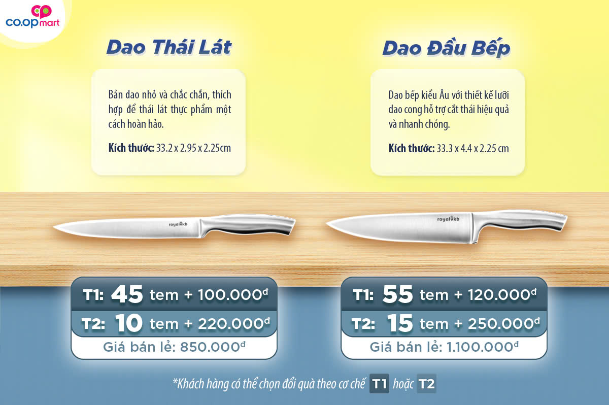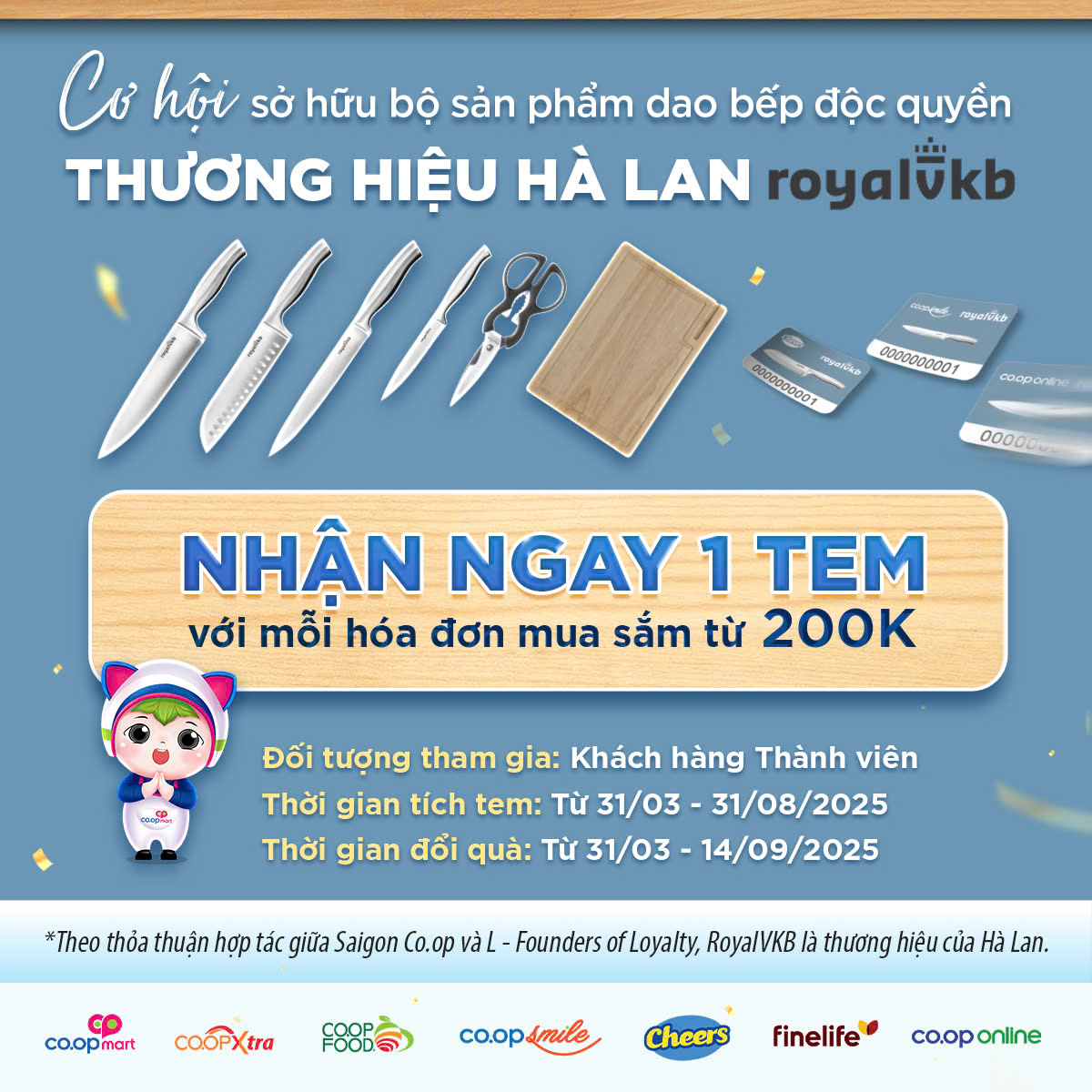Chương trình còn có ưu đãi miễn phí vận chuyển toàn quốc cho mọi đơn hàng, giúp bạn nhận quà dễ dàng mà không cần lo lắng về chi phí. Đừng quên tham gia ngay để có cơ hội sở hữu bộ dao RoyalVKB đáng mơ ước chỉ với 20 tem. Hãy nhanh tay săn tem và đổi quà ngay hôm nay để không bỏ lỡ những ưu đãi hấp dẫn từ Co.opmart nhé!