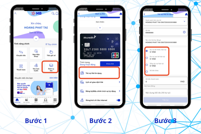 Để thực hiện thanh toán, bạn chỉ cần đăng nhập vào ứng dụng MBBank. Trên giao diện chính, chọn “Dịch vụ Thẻ”, sau đó chọn thẻ cần trả nợ và thực hiện các thao tác theo hướng dẫn. Thông thường, tỷ lệ thanh toán tối thiểu vào khoảng 2–5% tổng dư nợ, giúp bạn có thêm thời gian để sắp xếp tài chính.