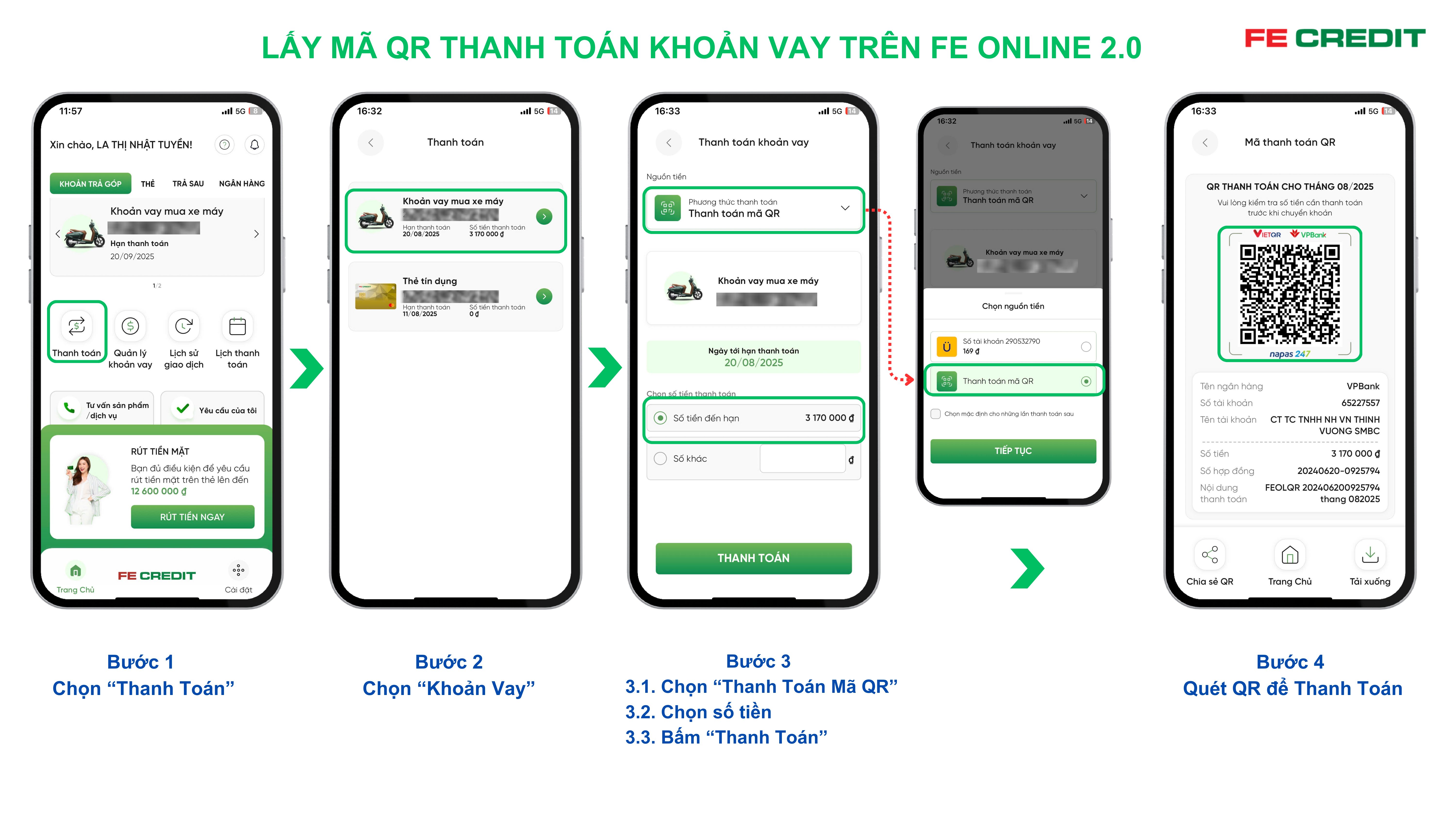 Ngoài ra, bạn cũng có thể thanh toán bằng chuyển khoản đến tài khoản ngân hàng của Fe Credit hoặc qua mã QR. Những giải pháp này vừa tiện lợi vừa bảo mật, giúp bạn chủ động hơn trong việc quản lý tài chính cá nhân. Hãy nhớ rằng việc thanh toán đúng hạn sẽ giúp bạn duy trì điểm tín dụng tốt và tránh phí phạt không cần thiết.