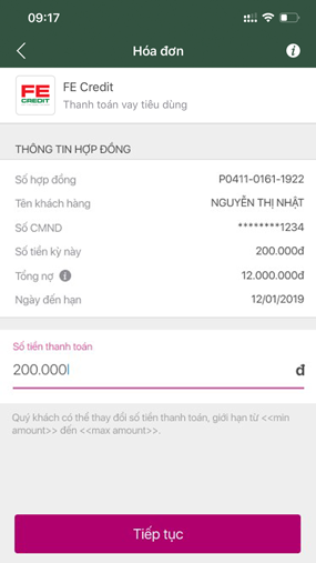 Khi đã chọn xong thẻ, bạn sẽ thấy các tùy chọn để thực hiện thanh toán. Hãy nhập số hợp đồng và số tiền muốn thanh toán vào ô yêu cầu. Ngoài ra, FE Credit còn hỗ trợ nhiều phương thức thanh toán tiện lợi, từ thanh toán trực tuyến đến trích nợ tự động.