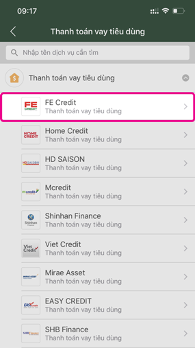 Nếu bạn không muốn sử dụng Internet Banking, bạn cũng có thể thanh toán qua ứng dụng ví điện tử MoMo. Từ giao diện chính, hãy chọn “Thanh toán khoản vay” và chọn Fe Credit để thực hiện giao dịch.