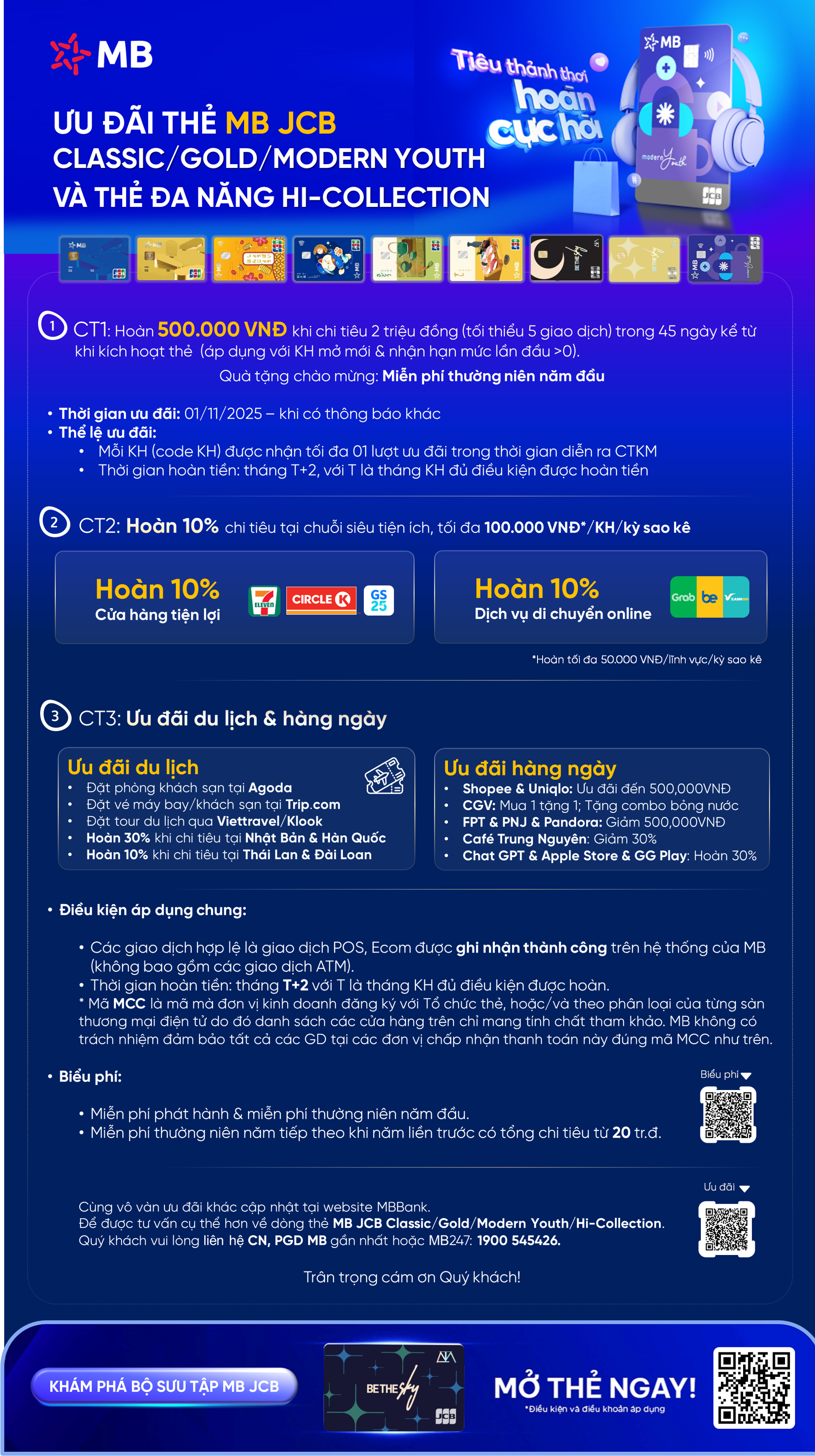 Ngoài ra, thẻ tín dụng quốc tế MB JCB Platinum và JCB Ultimate cũng rất được ưa chuộng, đặc biệt là trong giới trẻ, nhờ vào các ưu đãi hấp dẫn và dịch vụ chăm sóc khách hàng tận tâm. Thẻ JCB không chỉ có thể được sử dụng trong nước mà còn hỗ trợ giao dịch quốc tế, giúp người dùng thoải mái chi tiêu mọi lúc mọi nơi.