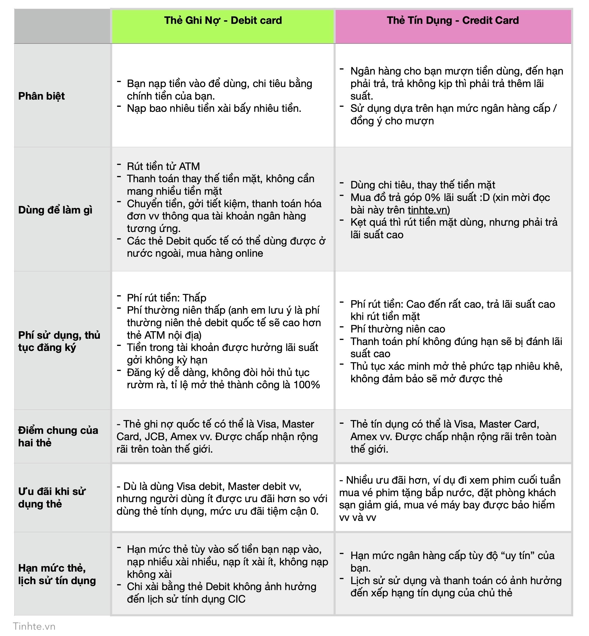 Về ưu nhược điểm, thẻ tín dụng thường đi kèm nhiều chương trình khuyến mãi hấp dẫn, nhưng bạn cần lưu ý đến lãi suất nếu không thanh toán đúng hạn. Còn thẻ ghi nợ giúp kiểm soát chi tiêu tốt hơn nhưng lại hạn chế trong việc khuyến mãi và vay tiền. Cả hai loại thẻ đều có những lợi thế riêng, và việc lựa chọn thẻ nào phụ thuộc vào nhu cầu cũng như thói quen chi tiêu của mỗi người.