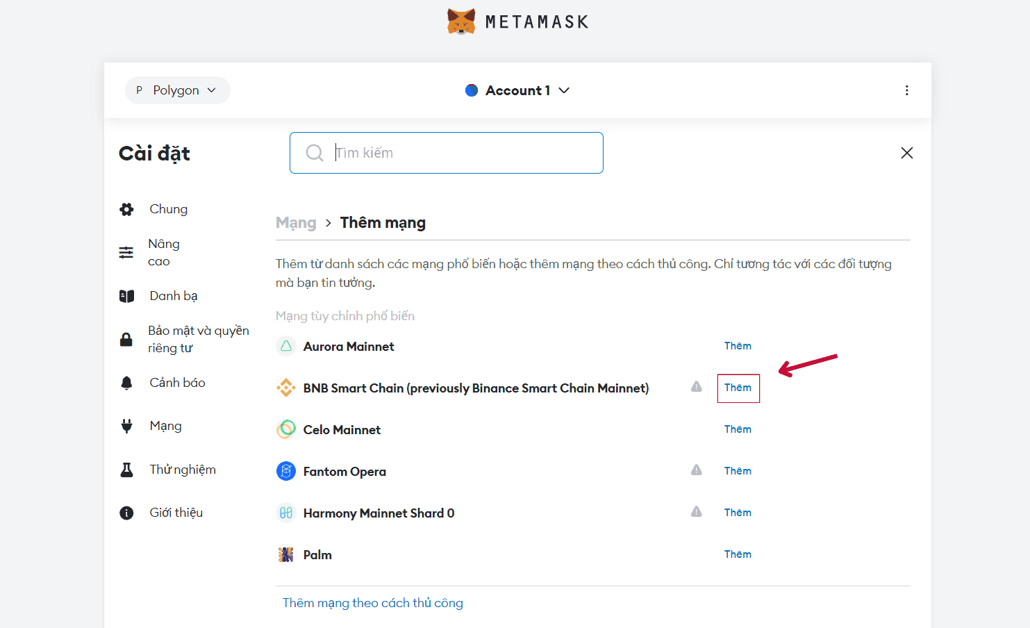 Có hai cách để thêm mạng BNB: bạn có thể chọn mạng BNB Smart Chain trong danh sách các mạng phổ biến rồi nhấn “Add” hoặc tự nhập thủ công các thông số như tên mạng, RPC URL, Chain ID, ký hiệu tiền tệ và địa chỉ block explorer. Cụ thể, bạn điền Network Name là “BNB Smart Chain”, RPC URL là “https://bsc-dataseed.binance.org/”, Chain ID là 56, Currency Symbol là BNB và Block Explorer URL là “https://bscscan.com/”.