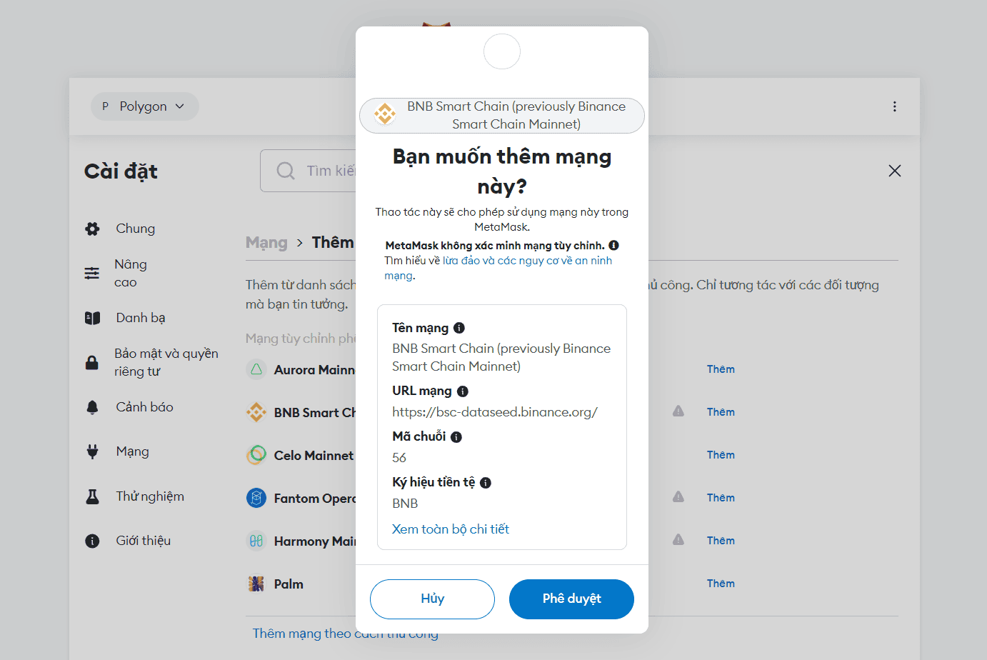 Có hai cách để thêm mạng BSC: tự động hoặc thủ công. Với cách tự động, MetaMask sẽ gợi ý mạng BSC, bạn chỉ cần xác nhận thêm vào là xong. Còn nếu thêm thủ công, bạn cần nhập các thông số sau: tên mạng là “Binance Smart Chain”, URL RPC là https://bsc-dataseed.binance.org/, Chain ID là 56, ký hiệu là BNB và URL Block Explorer là https://bscscan.com/. Sau khi điền đầy đủ, bạn nhấn lưu để hoàn tất.