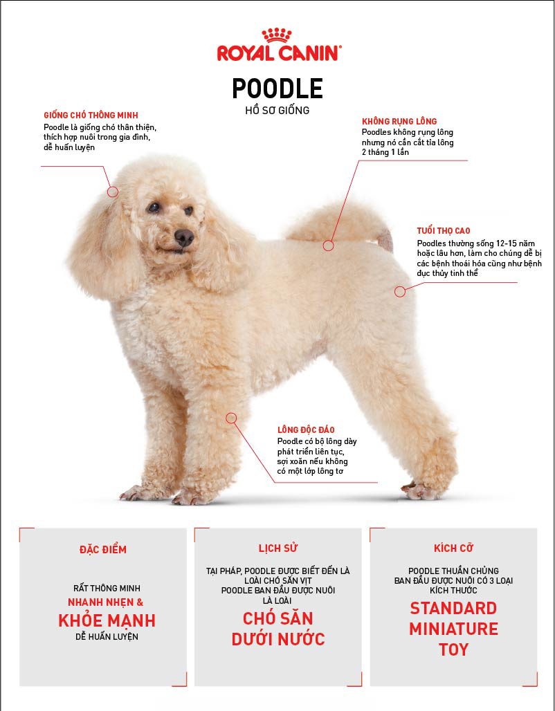 Sau này, người Pháp đưa Poodle vào hoàng gia, dạy chúng biểu diễn xiếc nhờ trí thông minh vượt trội. Từ chó săn mạnh mẽ, chúng dần được lai tạo thành các kích cỡ nhỏ hơn: Standard (lớn), Miniature, Toy, thậm chí Teacup.